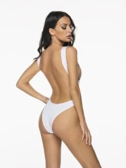 Super stylish is this classic triangle top with ruffles under the bust and ribbon tie detail on shoulders. The top features removable pads. The matching low rise bottom features bow detailing on the side straps. This scrunch rear cheeky bottom perfectly accents the top. Both top and bottom are fully lined. Feel like a fashion model with this one!!