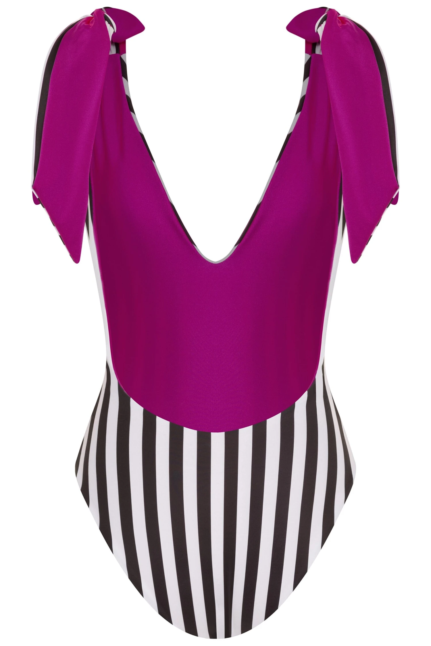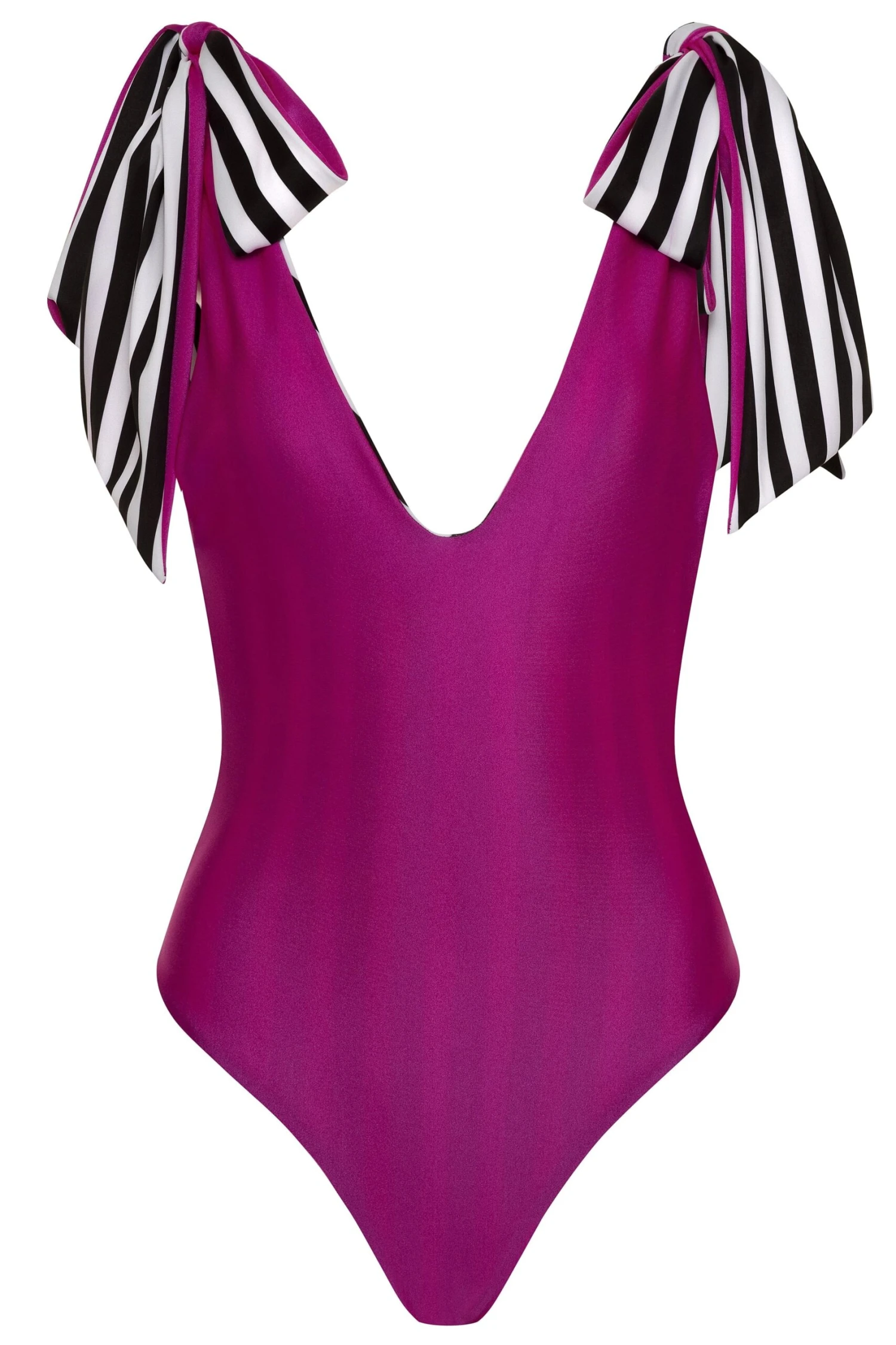 This bathing suit is reversible, featuring low-cut bag and self-tie bows.