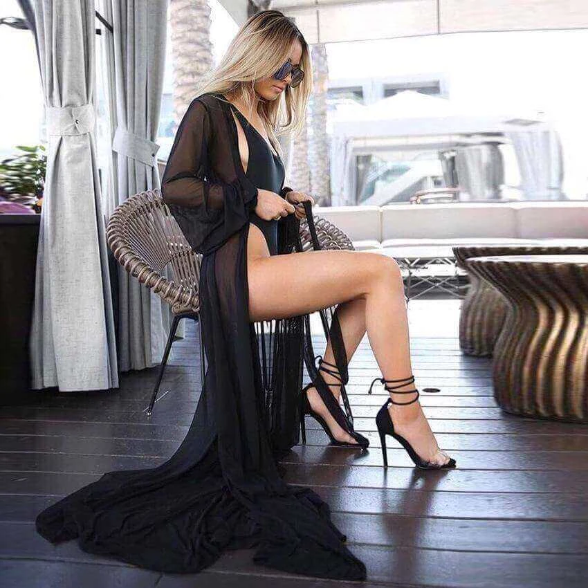 Classy and elegant is this long soft sheer fine mesh cover-up. This dress/cover-up features separate tie closures for around the waist to accentuate your figure, as well as, nicely finished edges on the mesh style fabric.The ends of each sleeve feature an elastic wrist trim to keep the sleeve in place. Available in colors black, nude, red, white, and peach. (bikini not included)