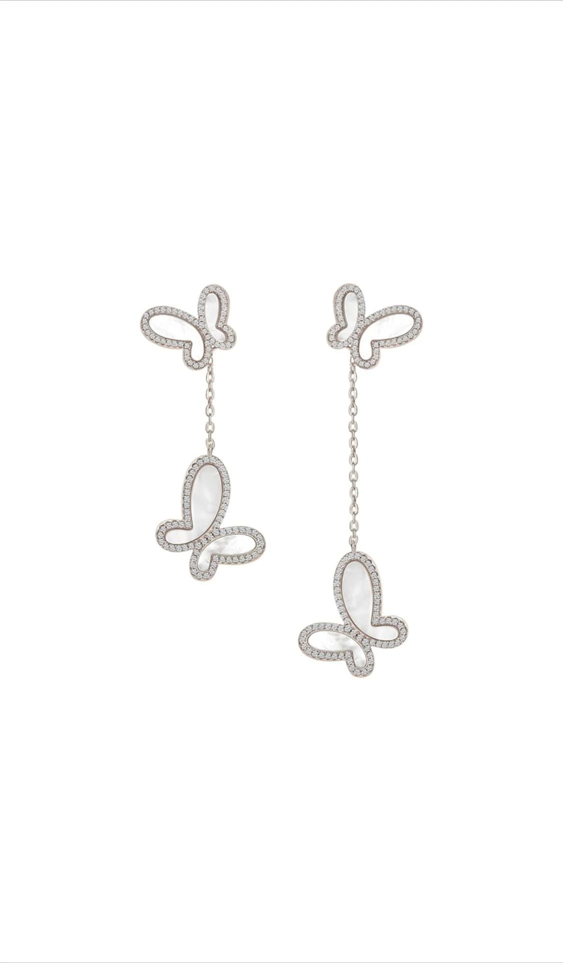 Made of pure silver with mother of pearl butterflies, encrusted with cubic Zirconia.